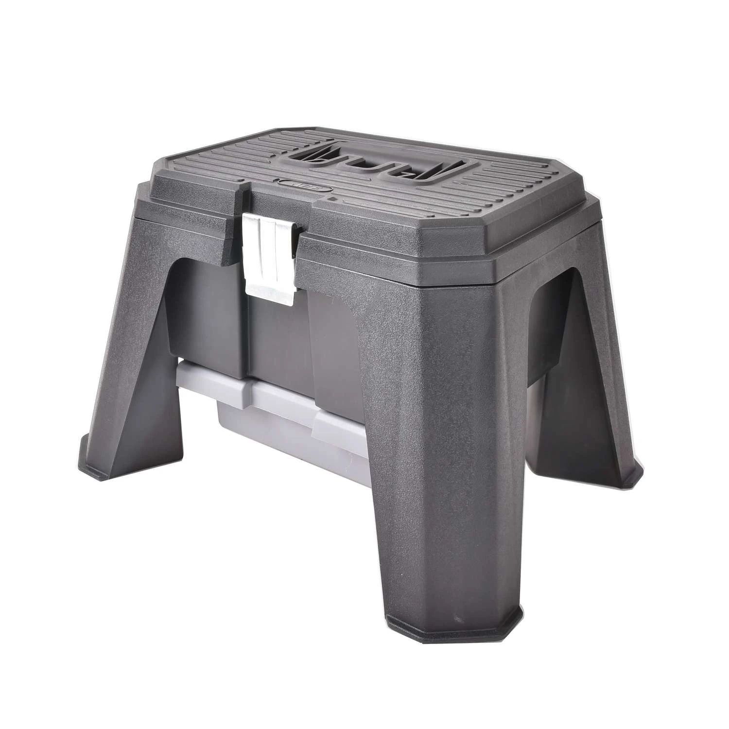 Tool storage with sturdy construction. Heavy duty steel latch and slide out drawerr. Integrated carry handle. Great for storage of tools, hardware and accessories Store tools or cleaning supplies in convenient step stool Integrated leg design provides superior strength and stability Large, sure-grip foot pads help prevent slippage Extra deep bottom storage area and bonus slide-out drawer for easy access to products Dual metal latches for secure closure