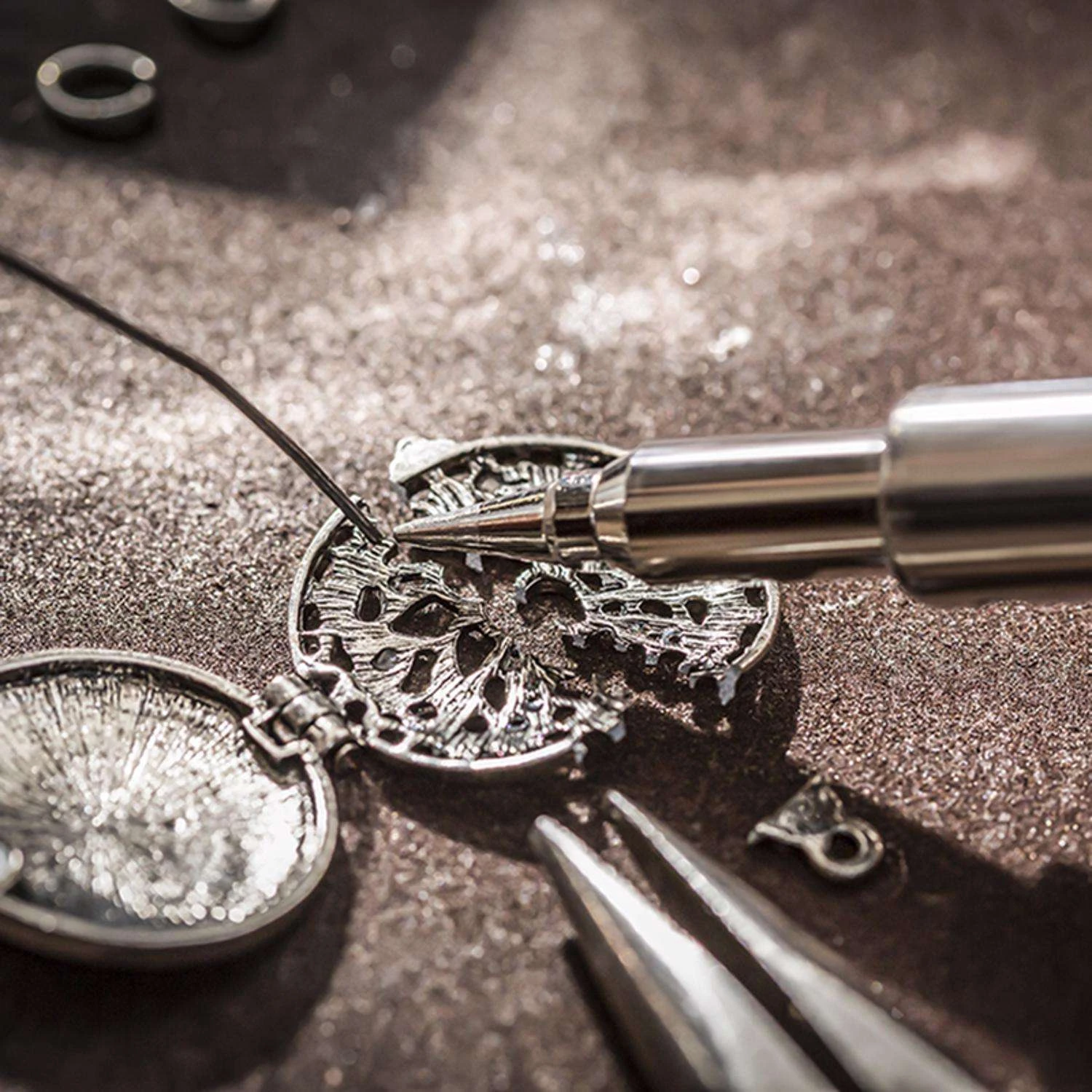 Designed for precision work including fine soldering, jewelry repairs, craft projects and heat shrinking wire, the Cordless Soldering Iron for Hobby and Household Use features three interchangeable settings soldering tip, hot air blower and micro torch. A flame adjustment fine-tunes the precision flame, the electric ignition makes lighting easy and a continuous flame lock keeps the torch lit while in use. Features a built-in auto ignite trigger Comes complete with soldering tip For use with butane fuel, such as the Bernzomatic 5.5 oz. butane cylinder Pinpoint flame for detailed work Adjustable flame control easily sizes flame for different applications Ideal for precision soldering, foam cutting and heating CPSC approved child resistant ignition