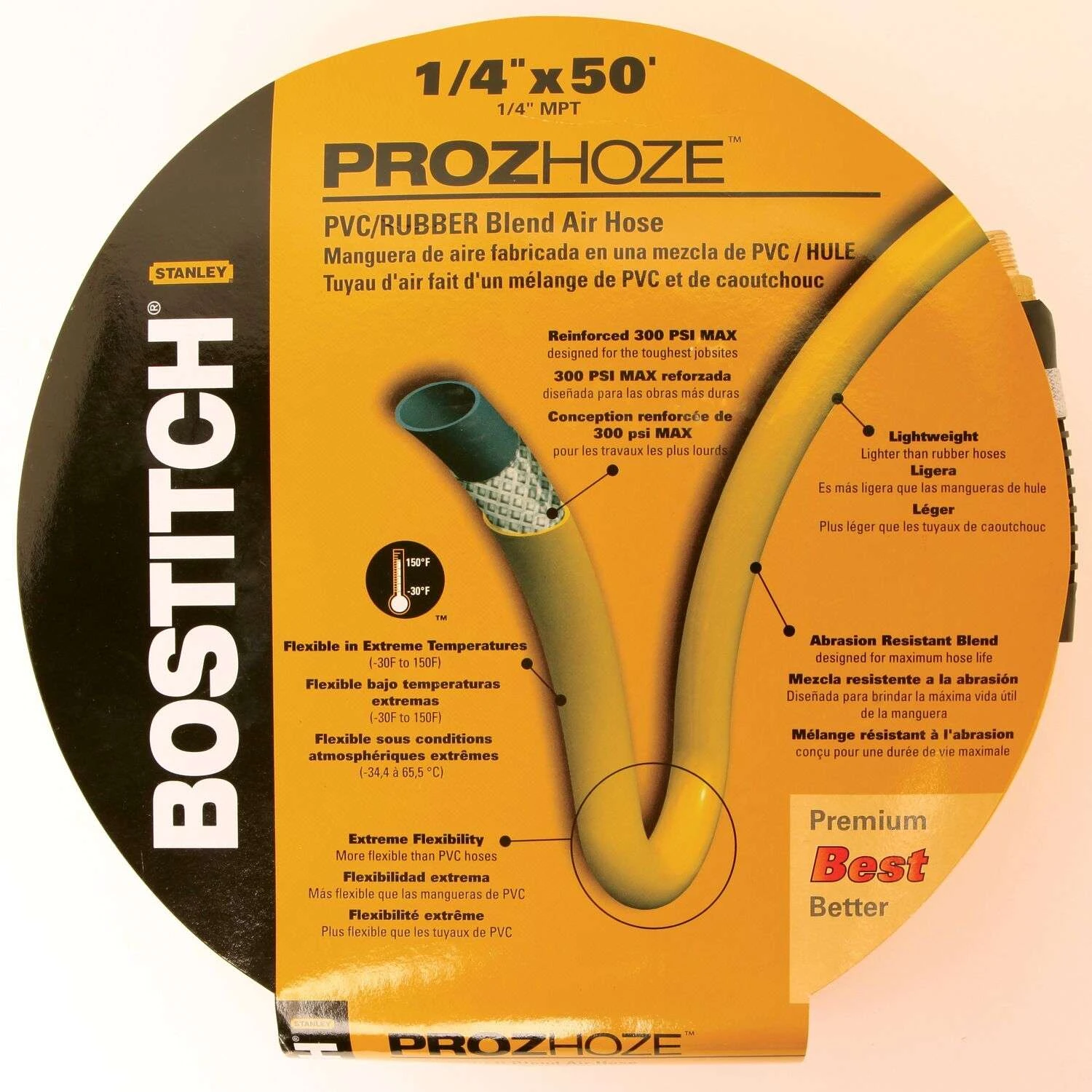 The Bostitch hose withstands a maximum operating pressure of 300 PSI Strain reliefs maintain the flexibility of the Bostitch 1/4-inch x 50-foot hybrid polymer blend air hose under pressure to extend its working life. The composite hose is abrasion and puncture resistant and can withstand temperatures from 30 degree Fahrenheit to 150 degree Fahrenheit. The Bostitch rubber blend air hose doesn’t kink or coil while in use, and its bright yellow color keeps it safely visible on the job site. The hose is 1/4 inch in diameter and 1/4-inch fittings that can be changed out quickly on site. The Bostitch PVC air hose extends a full 50 foot. Reinforced 300 PSI max operating pressure designed for maximum hose life Hybrid polymer blend of rubber and PVC is abrasion resistant designed for the toughest jobsites Flexibility in extreme temperatures (-30F to 150F) Low memory allows hose to lay down flat and does not kink or coil up when in use Strain reliefs provide flexible reinforcement for extended life Safety yellow color for improved job-site visibility Hybrid polymer hose design is lighter than rubber hoses