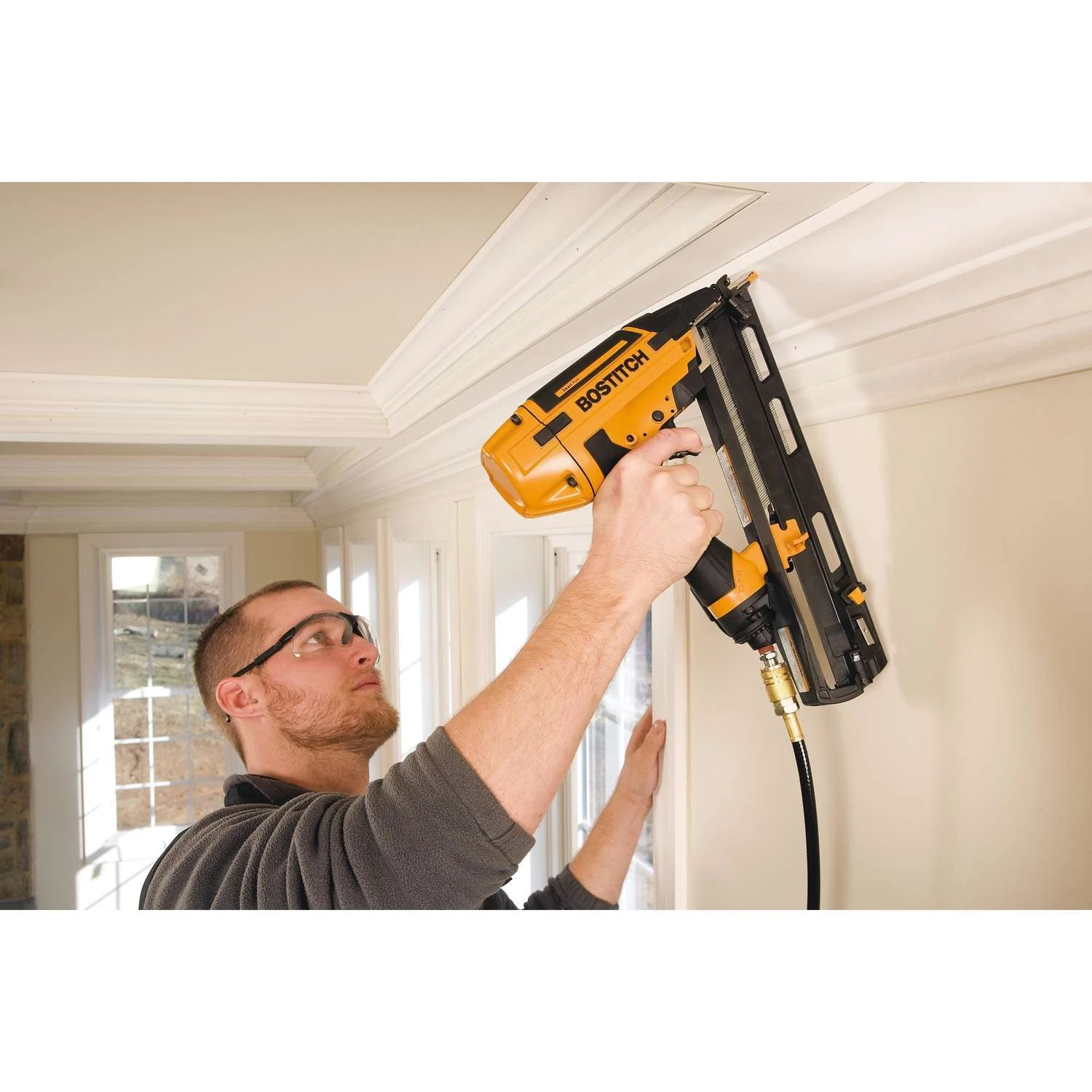 Use this Bostitch Smart Point 15 ga “DA” Style Angle Finish Nailer Kit in tight spaces. Control the depth of the nail without interrupting workflow and easily remove nails with tool-free jam release feature. Depend on this 15 ga finish nailer kit for efficiency and precision. Drives 15 ga “DA” style angle finish nails from 1-1/4 inch to 2-1/2 inch length Integrated air blower allows to clear away debris from work surface Tool-free jam release mechanism for easy nail removal Dial-A-Depth control for precise countersinking of nails 16 inch on-center gauge flips out to measure exactly 16″ from end to nose for installing wall trim Selectable trigger system for sequential or contact operation Oil free operation, rear air exhaust and belt hook with integrated pencil sharpener