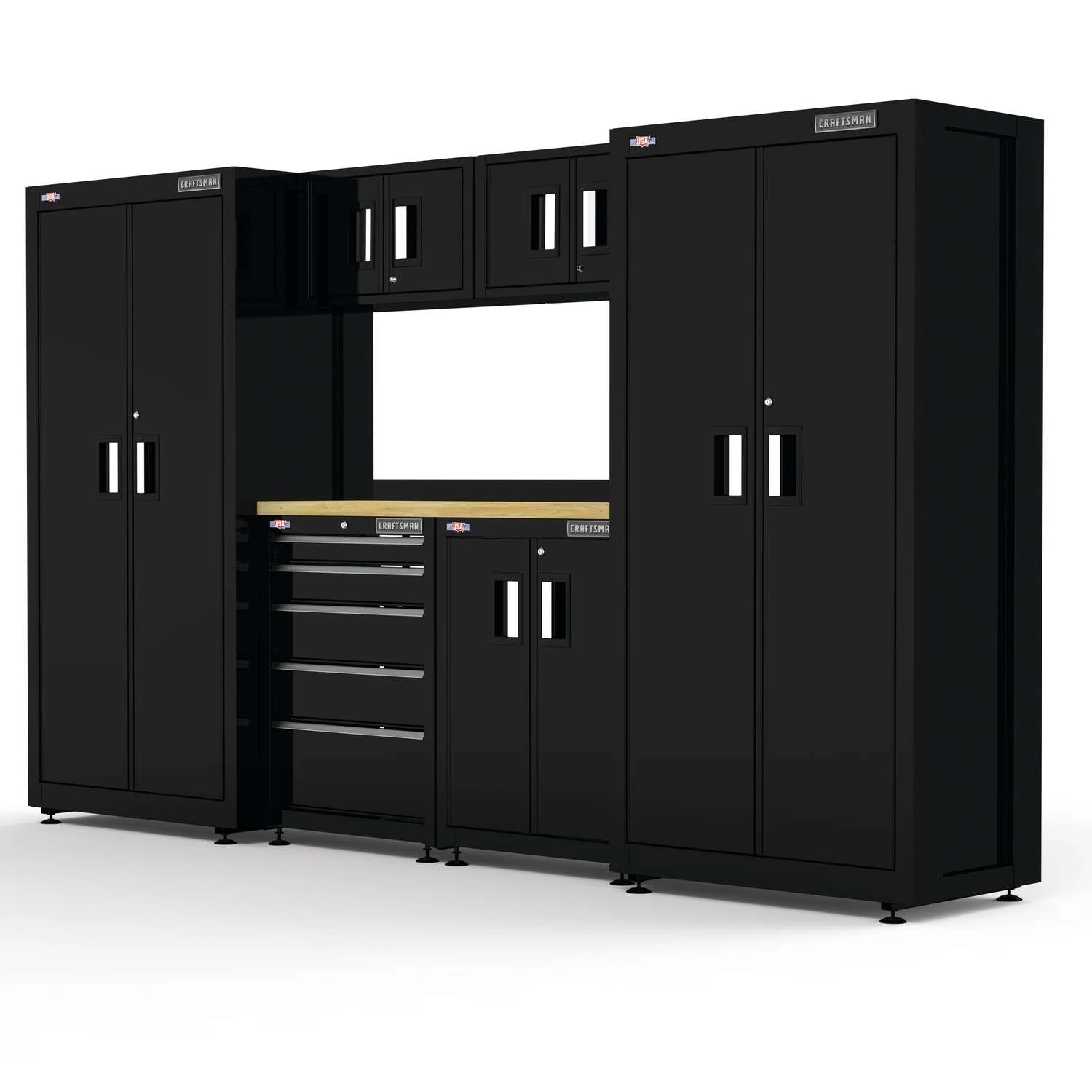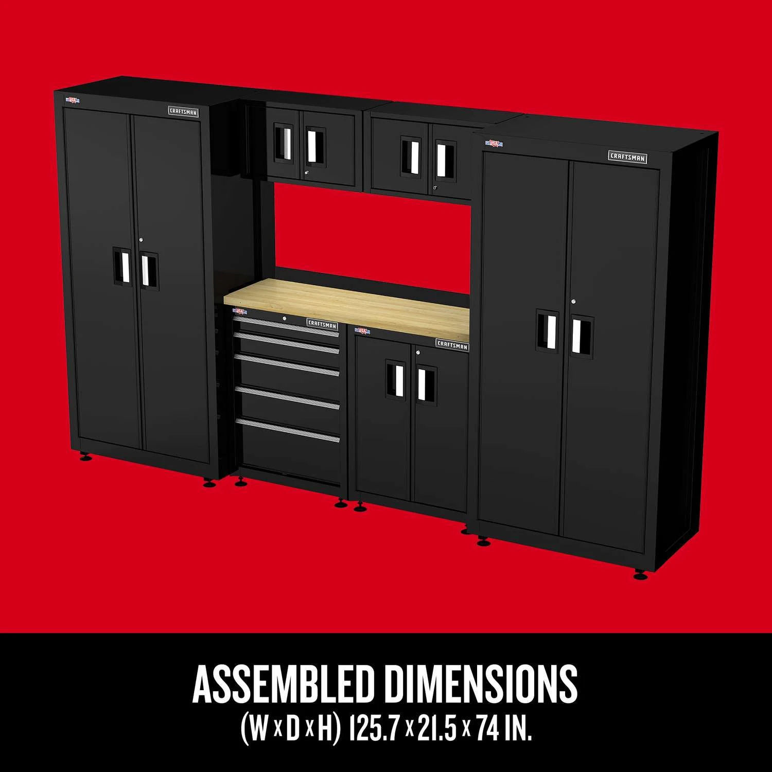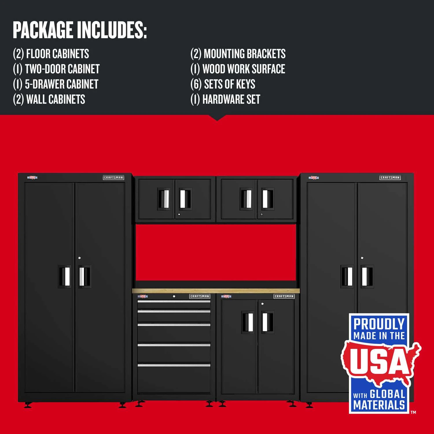 | What's Included | (2) Floor Cabinets, (1) 2-Door Cabinet, (1) 5-Drawer Cabinet, (1) Wall Cabinets, (2) Mounting Brackets, (2) Wood Work Surface, (6) Sets of Keys, Hardware for Installation |