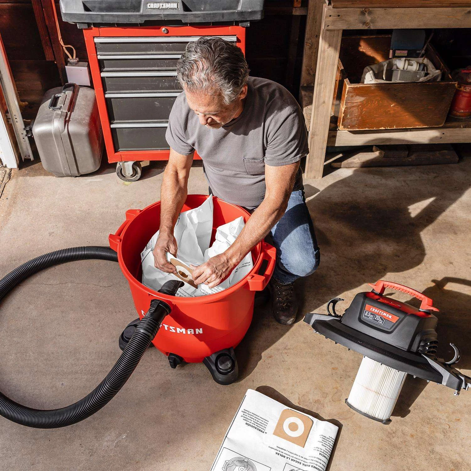 The CRAFTSMAN 16 & 20 Gallon General Purpose Dust Collection Bags for wet/dry vacs are designed for pick-up of everyday dirt and other dry debris. They help contain all the debris from your home improvement projects, big or small and keep your vac from blowing the fine particles back into the air. Bags are easy to install by attaching to vacuum port inside tank without needing tools and are even easier to toss away. Includes 3 dust bags. FITS: 16 and 20 gallon CRAFTSMAN vacs DESIGNED FOR DRY PICK-UP: Dust bag for dry debris pick-up only to make clean-up fast and easy COLLECTS EVERYDAY DIRT: Dust bag designed for capturing everyday dirt, dust and debris REDUCE CLEAN-UP TIME: Vacuum bag makes debris disposal quick and easy, reducing the time required to clean the wet dry vacuum cleaner INCLUDES: 3 dust bags COMPATIBLE WET/DRY VACS: CMXEVBE17595, CMXEVBE17607, and CMXEVBE17596 CRAFTSMAN Shop Vacuums