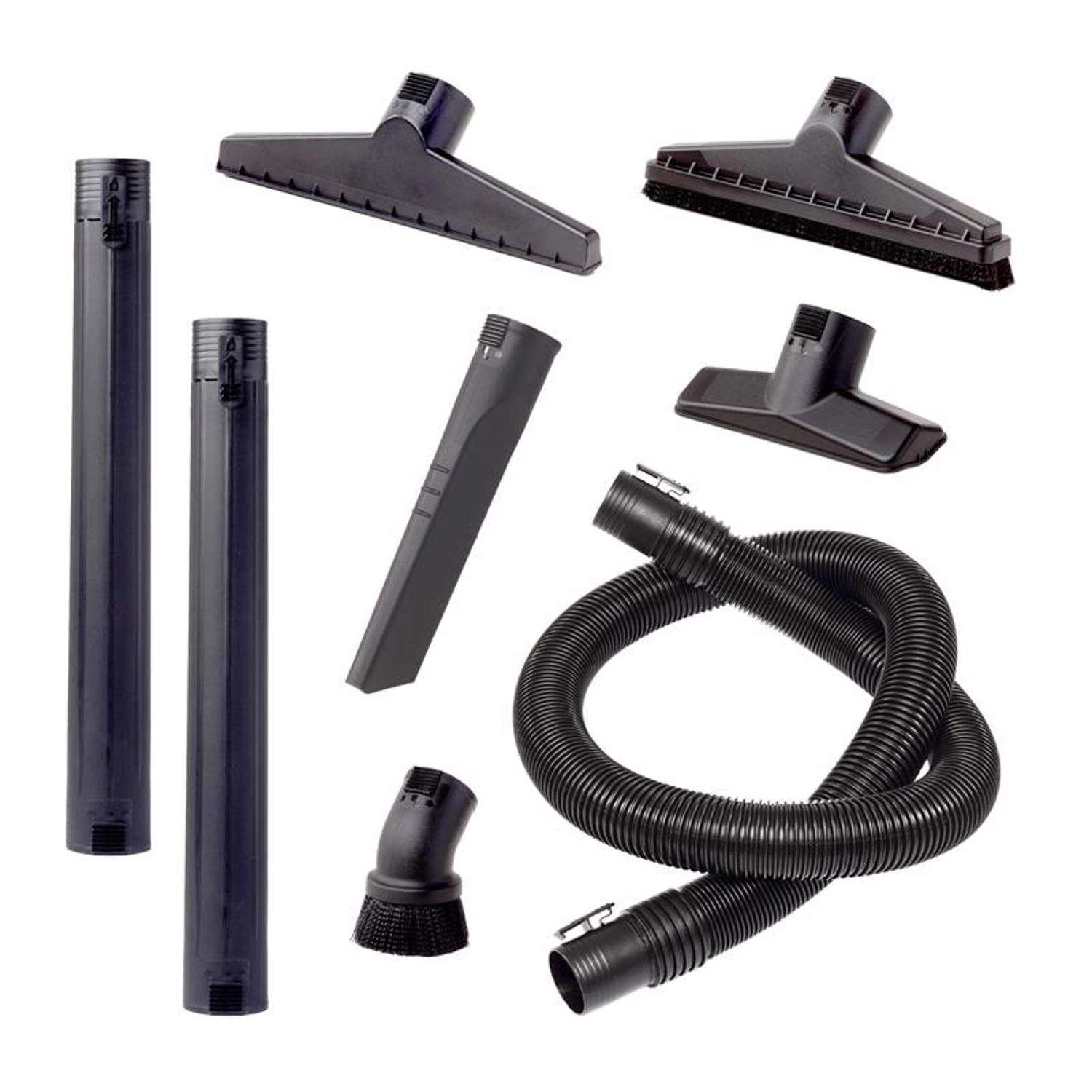 Take on tough messes with the 2-1/2 in. Pro Locking Accessory Kit for shop vacuums. Versatile and durable, this 7-piece attachment kit is designed for heavy-duty project pickup and comes conveniently packaged together to meet your cleaning needs. The 7-ft DUAL-FLEX hose allows for 180 degrees of flexibility to maximize maneuverability. With 2 extension wands, you can clean floors, hard-to-reach places, and even overhead areas, such as ceiling fans, ceiling vents, floors, and shelving. With two extension wands, you can clean floors, hard-to-reach places, and even overhead areas, such as ceiling fans, ceiling vents, floors and shelving. The dusting brush is perfect for detailing intricate surfaces and picking up project debris. Capture pooling liquid on hard surfaces like garage floors and patios. Use the crevice tool to reach into awkward spaces and tight corners that you wouldn’t be able to reach otherwise. Lastly, the utility nozzle is designed to be a multi-purpose wet/dry vac attachment that makes job pickup quick and easy and is ideal for workbenches and small messes. With the POS-I-LOCK design, your accessories securely attach to hoses and wands. Locking accessories won’t fall off during use so you can clean with confidence to get the job done. Fits CRAFTSMAN shop vacs with a 2-1/2 in. diameter hose. FITS: CRAFTSMAN and most shop vacuums that use a 2-1/2 in. diameter hose PERFECT FOR HEAVY-DUTY PROJECTS: The variety of specialized attachments all lock into place to securely capture wood chips, dust, and other small particles * MANEUVERABLE: Connect the 7-foot DUAL-FLEX hose to your wet/dry vac to extend the reach of your vac SECURE FIT: The DUAL-FIT POS-I-LOCK hose connects easily and stays locked to the vac and each attachment WET NOZZLE IDEAL FOR HARD SURFACES: Rubber squeegee provides a thorough clean on hard floors EXTENSION WAND CLEANS HARD-TO-REACH AREAS: Attach the wet dry vacuum extension wands to the vac hose to clean hard-to-reach areas without the use of a step ladder DUSTING BRUSH PERFECT FOR STUBBORN DEBRIS: Captures wood chips, metal shavings, dust and other small particles FLOOR BRUSH WITH TWO BRISTLE SIZES: Two bristle sizes to make clean-up more efficient; one side of brush has 3/8 in. bristles, and the other side has 5/8 in. bristles CREVICE TOOL IDEAL FOR TIGHT AREAS: Reaches into slim, narrow areas where your hose can’t reach