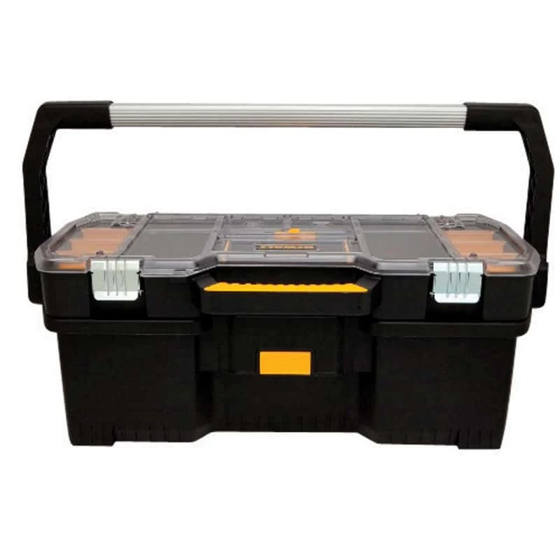 This tool from is two storage units in one a handy jobsite tote for tools and supplies and a detachable organizer for small parts. The two units snap together for easy transport to and from the jobsite. Top case organizer for small parts with integrated handle Heavy duty design for durable structure Long metal carry handle for easy grip and carrying Front push button for easy detaching/attaching of the organizer to the tote unit 11-1/5 in. height Latch is made of metal 669.93 mm length 323.05 mm width