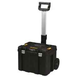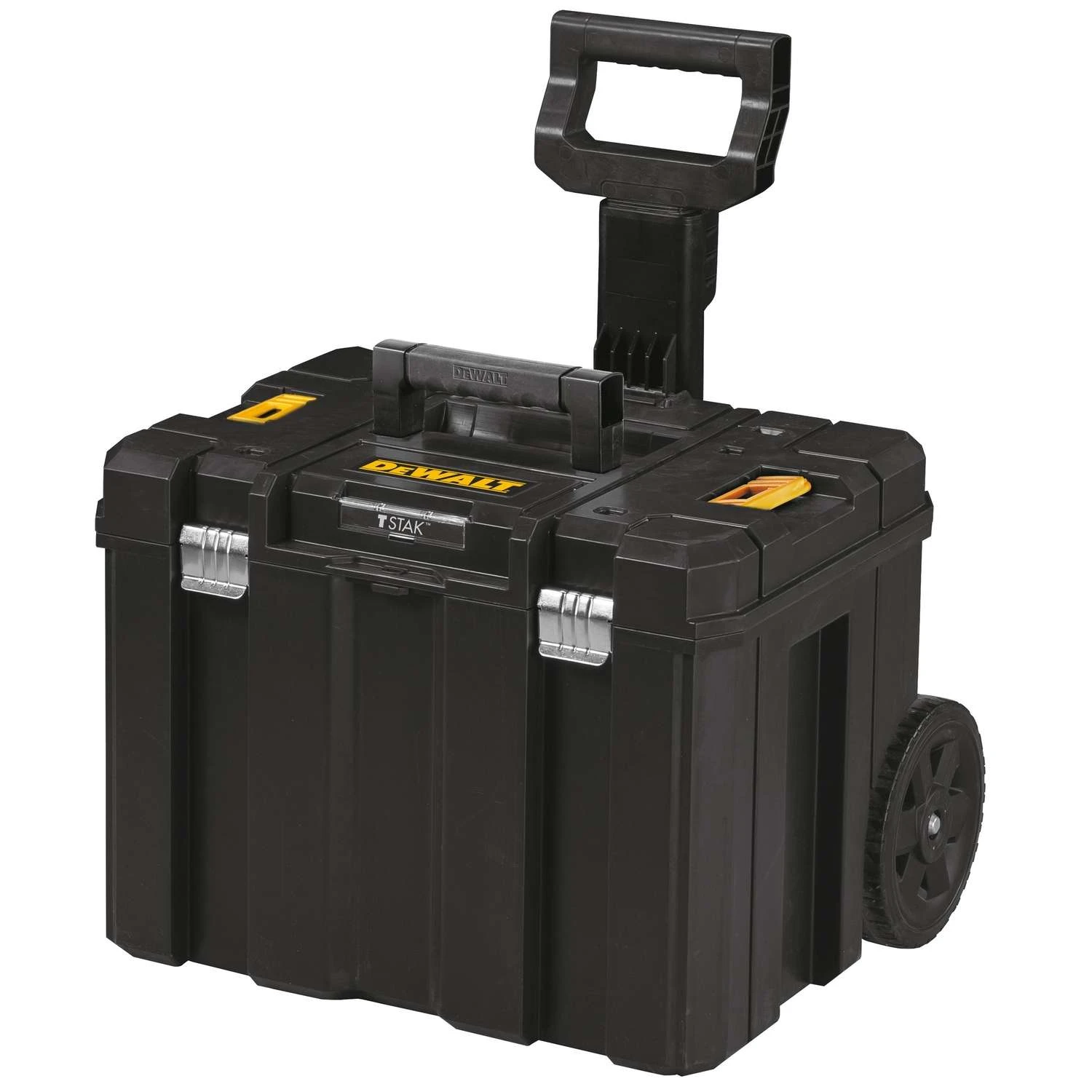 The DeWalt TSTAK Mobile Storage unit combines a large volume storage tool box with durable 7″ wheels. With rust-resistant metal latches, bi-material top handle and side latches that allow stacking all other TSTAK units on top, this is a great maneuverability solution. Maximum storage volume – thanks to metal-plastic telescopic handle leaning backwards feature Push button for handle opening and closing for easy storage Bi-material top handle for convenient carrying Durable 7″ wheels Anti-rust metal latches All units can stack on top of each other, connected with durable side latches