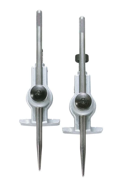 The number 523 adjustable trammel is ideal for transferring measurements, scribing arcs and drawing large circles. It accurately measures and marks distances beyond range of conventional compasses and dividers. Adjustable trammels Ideal for marking and scribing over large distances Scribers are adjustable are can be replaced with pen or pencils Clamp opening fits 5/8 in. to 1-1/2 in. beam Set includes two trammels and two 6 in. scriber points Accurately measures and marks distances beyond range of conventional compasses and dividers. Included eccentric points can be replaced by pencils, ballpoint pens, crayons or soapstone sticks. Die-cast body and ground needlepoint legs. Fine adjusting screw for point setting.