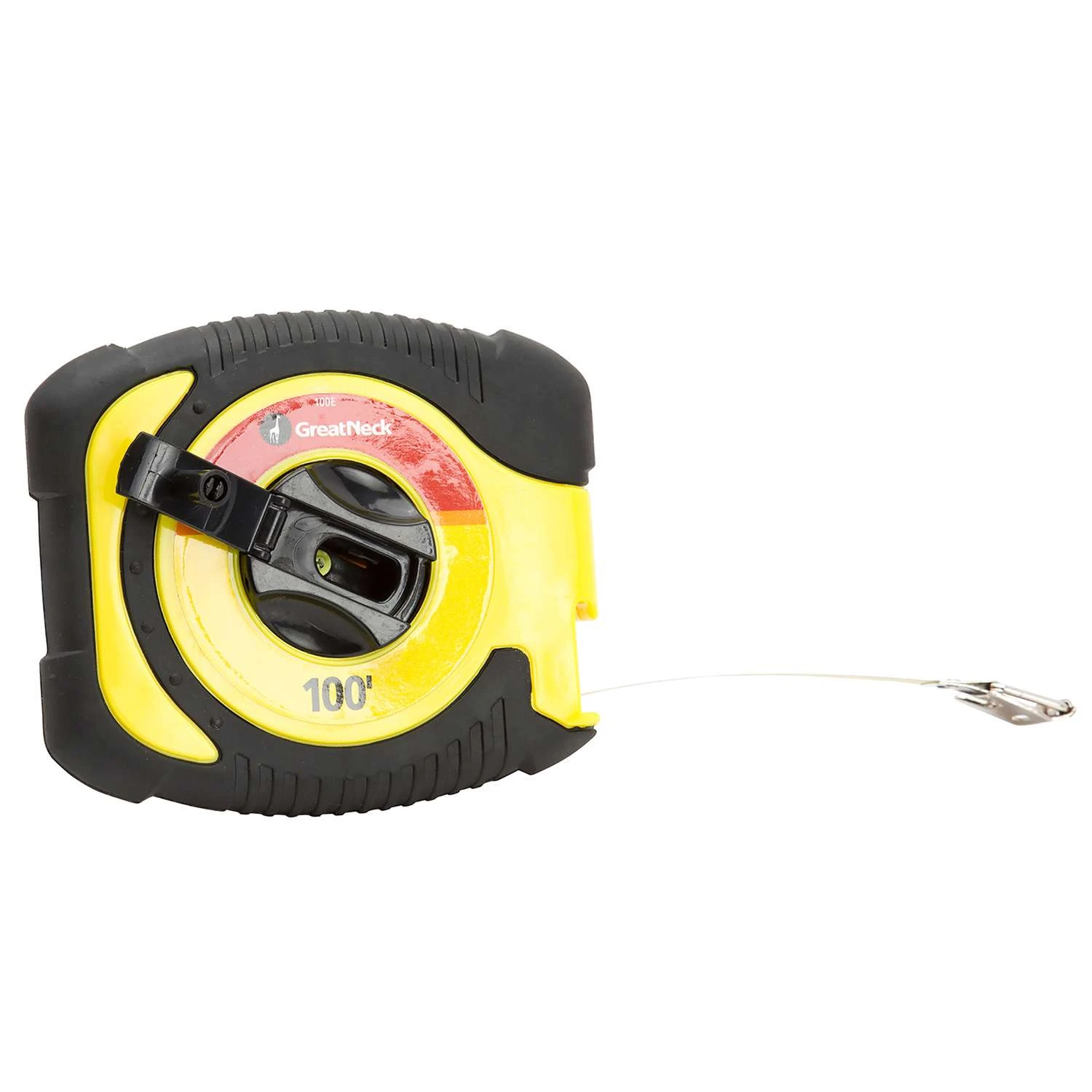 The GreatNeck 100 ft. steel long tape takes care of long distance measuring while delivering our best-in-class blend of style, quality and affordability. The flexible steel tape offers durability while the easy rewind mechanism firmly locks the blade into the case, ensuring the hook doesn’t get caught on anything. The high impact, ergonomic rubber grip case is ultra-comfortable while withstanding unintentional drops and typical wear and tear. Easy-to-read markings graduated in 1/8s with 16 inch on center markings High impact plastic case A steel belt clip holds it firmly on your belt for easy portability