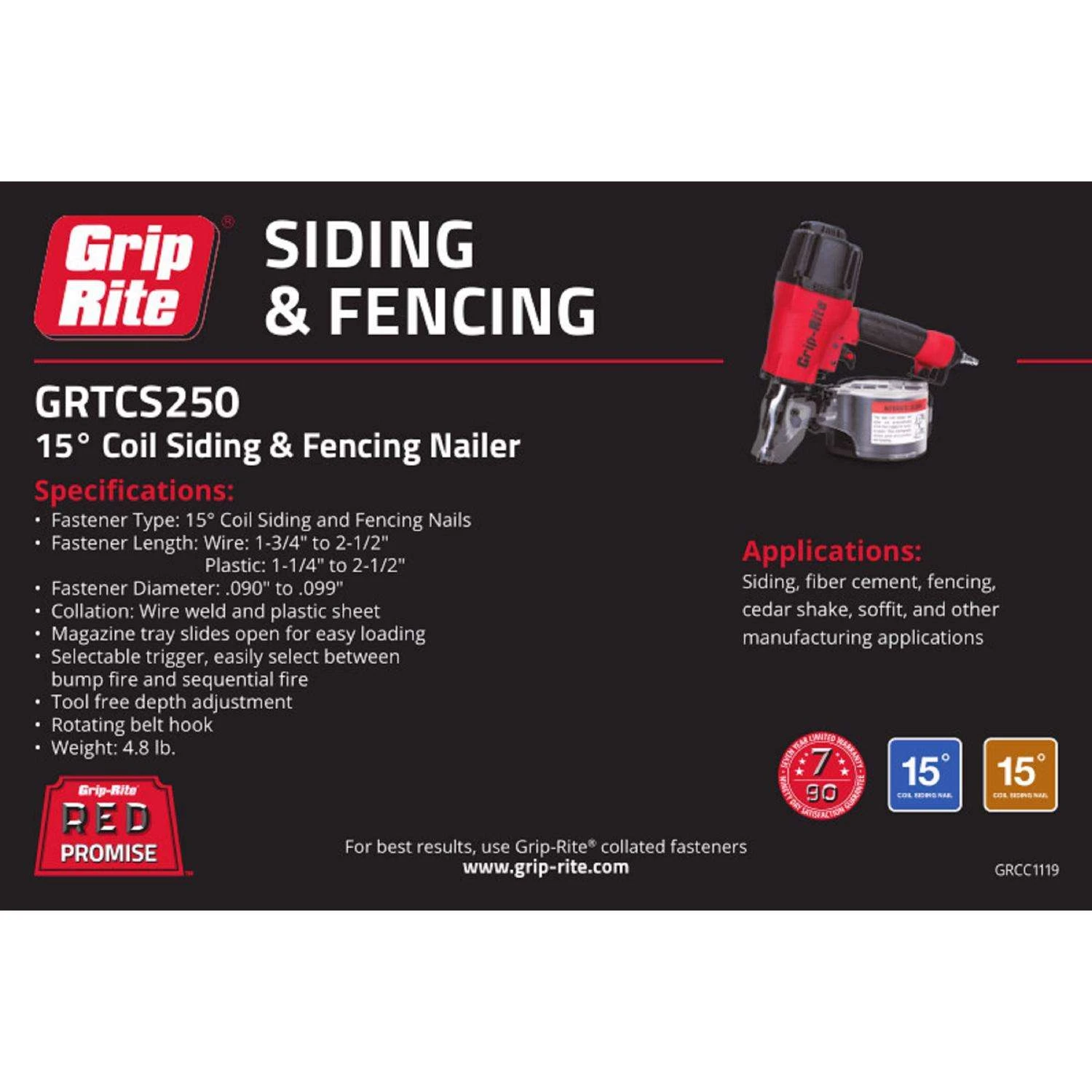 The Grip-Rite RED System GRTCS250 coil nailer is designed with the professional contractor in mind. As part of the RED System, it features a lightweight and balanced design and excellent firing power to handle your toughest jobs – from siding and fiber cement to trim, fencing, cedar shake, soffit and other manufacturing applications. The tool is equipped with a 360° tool-free air exhaust, rotating belt hook and a durable molded rubber comfort grip. A no-mar pad protects work surfaces from damage. The GRTCS250 has a magazine capacity of 200-350 depending on the fastener type. It shoots 15° plastic coil nails with a length of 1-1/4 in. to 2-1/2 in. (Plastic) and 1-3/4 in. to 2-1/2 in. Wire. Selectable trigger to switch easily and quickly between sequential and bump fire mode Tool-free depth adjustment to easily set desired nail driving depth and prevent damage to your project Sliding metal reinforced magazine tray provides fast easy loading of plastic coil fasteners for increased production Belt hook allows you to hang tool out of the way when both hands are needed Removable no-mar pad to protect the work surface 360 degree tool free air exhaust directs air away from the user or work surface 360 Degree Tool Free Air Exhaust Directs Air Exhaust Away From User Or Work Surface When Needed Includes No-Mar Pad Protects Work Surface