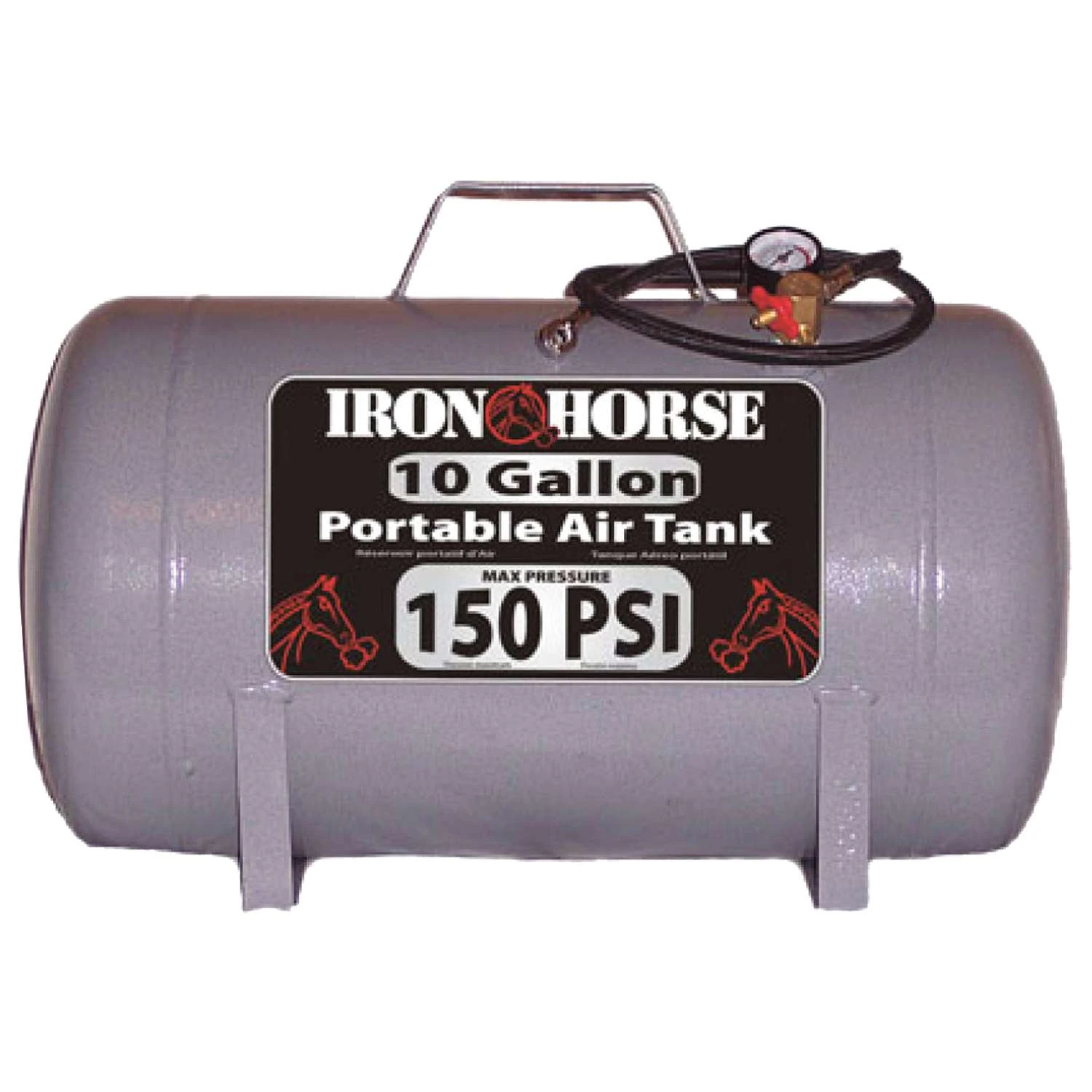 The Iron Horse 10 gallon portable air carry tank has a market leading pressure rating of 150 psi. This enables the user to perform more inflating projects. The finish on the air carry tank is power coated hammered paint that help prevent rusting, giving the owner many years of use. Unit comes with a 4 ft. 1/4 in. braided hose and brass ball tire chuck that makes inflating easier. Easy read tank gauge allowing the user to see how much air is in the tank before the need to refill. allows tank to be pressurized up to 150 PSI Ideal for inflating automotive tires, inflatable toys & balls Excellent source of silent air for operating small brad nailers or staplers