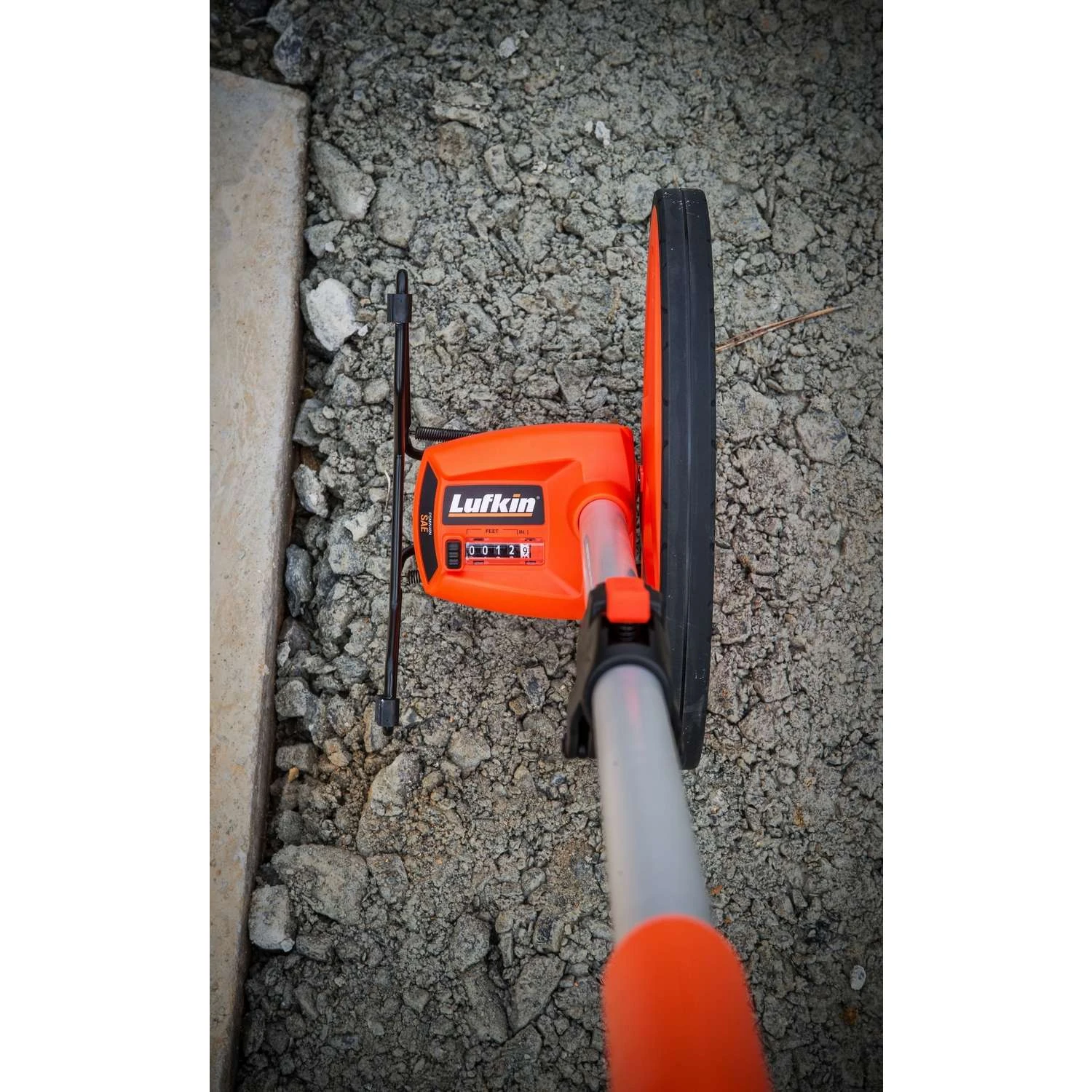 12 inch professional SAE measuring wheel with over-mold pistol grip handle for increased use comfort. Bolstered folding joint allows for compact storage and longer product life. Designed to open under direct stress instead of breaking. Heavy Duty Counter Reset Easy-Read Non-Glare Counter Hi-Viz Orange to Help Identify Wheel on Crowded or Wooded Jobsite Measurements Presented in Feet