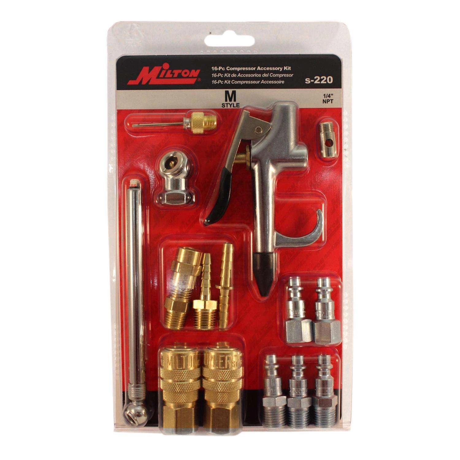 16 piece M-style compressor accessory kit is perfect kit for a new compressor or just updating a current compressor. Kit includes a variety of 1/4″ couplers, plugs and a pencil gages. Ideal for DIY projects, repair shop, mobile repair and maintenance. Includes 16 of the most popular Milton items to set up air lines from compressor Long lasting Made with high quality material
