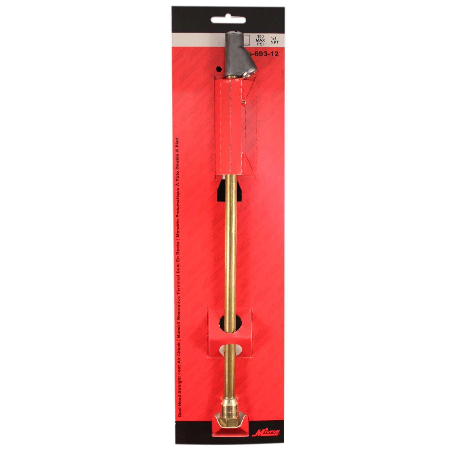 Extended reach dual head straight foot air chuck for inner duals has is designed and manufactured to exacting standards. The extra reach of 12 inch is great for inflating the inner duals. Sealing type chuck is closed and is for use on an airline. With a cushioned grip handle, this air chuck also locks onto tire valve thread. Not for use with an inflator gage. Both ends lock on valve core threads These are not for use with an inflator/ pressure gauge Durable construction