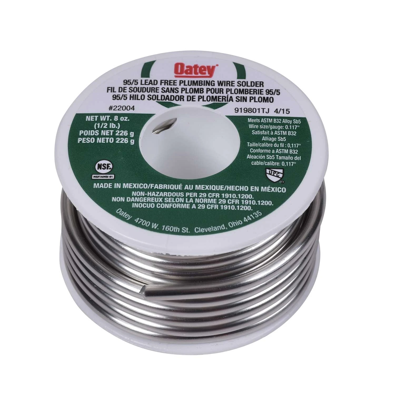 Oatey® 95/5 Lead Free Plumbing Wire Solder is a tin-antimony wire solder designed for use in plumbing applications where frequent and extreme temperature changes and vibrations occur.Oatey 95/5 Lead Free Plumbing Solder is a solid wire solder for use in plumbing applications where frequent and extreme temperature changes and vibrations occur. 95/5 Solder is commonly used for potable water applications, refrigeration lines and cooling equipment. 95/5 Solder complies with CA & VT lead content regulations. Lead-free alloy of 95% tin and 5% antimony. 450F – 464F melting range. Meets the requirements of the Safe Drinking Water Act. Complies with CA and VT lead content regulations. Commonly used for potable water applications, refrigeration lines and cooling equipment.