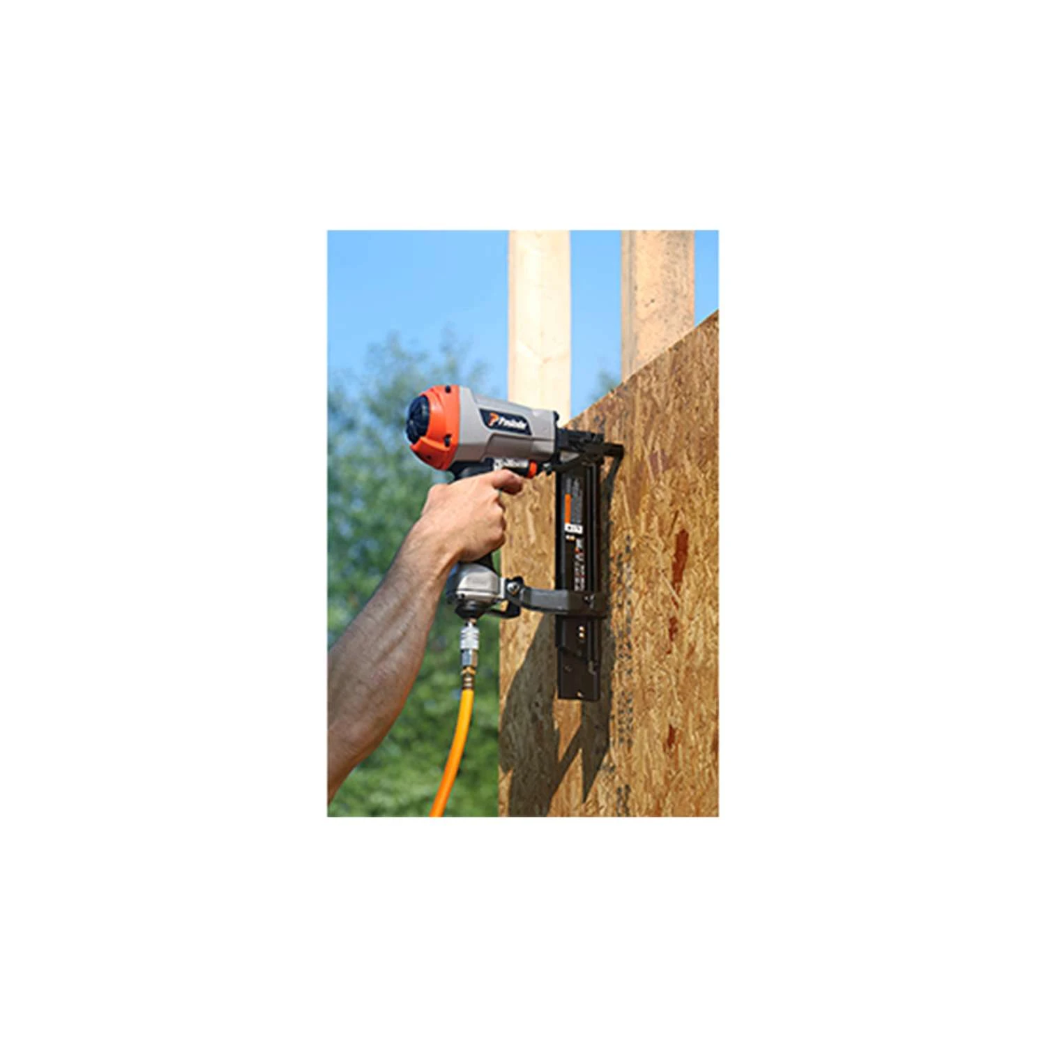The New Paslode 16ga Standard Crown Stapler is built for professional framers with speed and power that will increase jobsite productivity by allowing you to work quickly, never having to pull out your hammer to finish off staples. This durable stapler will hold up to any jobsite conditions or high volume industrial usage. Up to 10 staples per second keeps up with any application Durable all-metal magazine for long-lasting life U-Shaped driver blade decreases slipping to ensure complete drive with every shot Tool-Free adjustable depth of drive for consistency when driving in any material Tool-Free jam clearance Adjustable steel utility hook that easily hangs over 2X4 for convenient storage when needing both hands Adjustable exhaust valve – quickly swivel to ensure dust and debris blow away from you Small rounded nose – easy mobility to shoot quickly and accurately