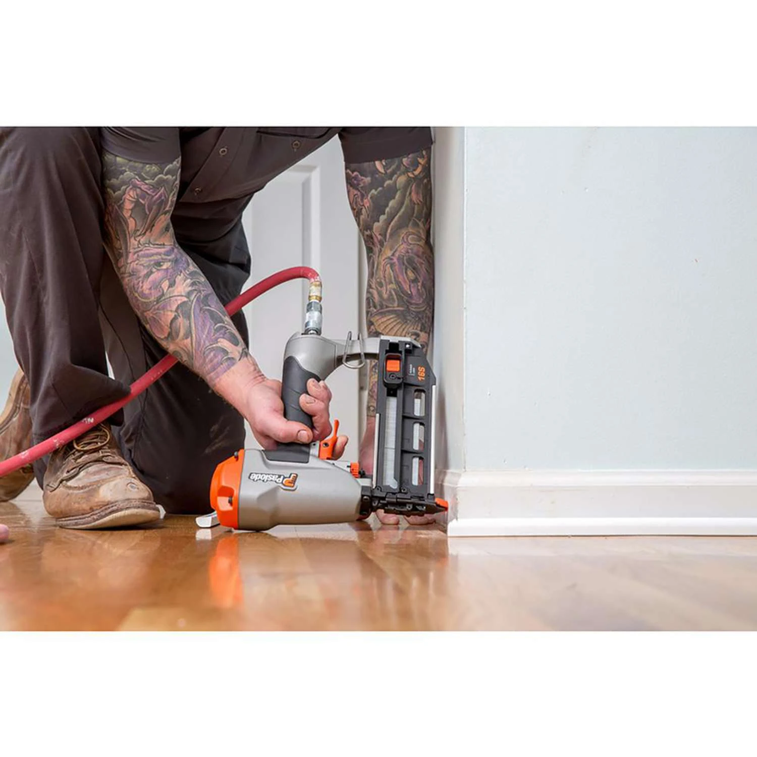 The Paslode 16 Ga. Pneumatic Finish Nailer has a best-in-class design that allows for comfort in all applications. This is a reliable and durable tool you can trust to keep up with you. The oil-free design allows for a maintenance-free operation which reduces cleanup time and associated costs.No mar tip protects premium wood and nail lockout prevents blank driving Best in class ergonomics – designed with enhanced features to optimize balance, maximize comfort, reduce fatigue and increase productivity Reliability and durability – proven performance that saves you time and can keep up with you Low maintenance – oil-free design allows for long term, maintenance-free operation which reduces cleanup time and associated costs Consistent nailing – each time the trigger is pulled, the nail drives flush into the trim Open line of sight for precise nail placement Enhanced trigger allows for two finger placement to assist your index reach Rubberized grip and handle designed for improved comfort and a secure hold Rear exhaust vents air out of the back of the handle and away from you Tool free depth of drive is easy to adjust, even with gloves on