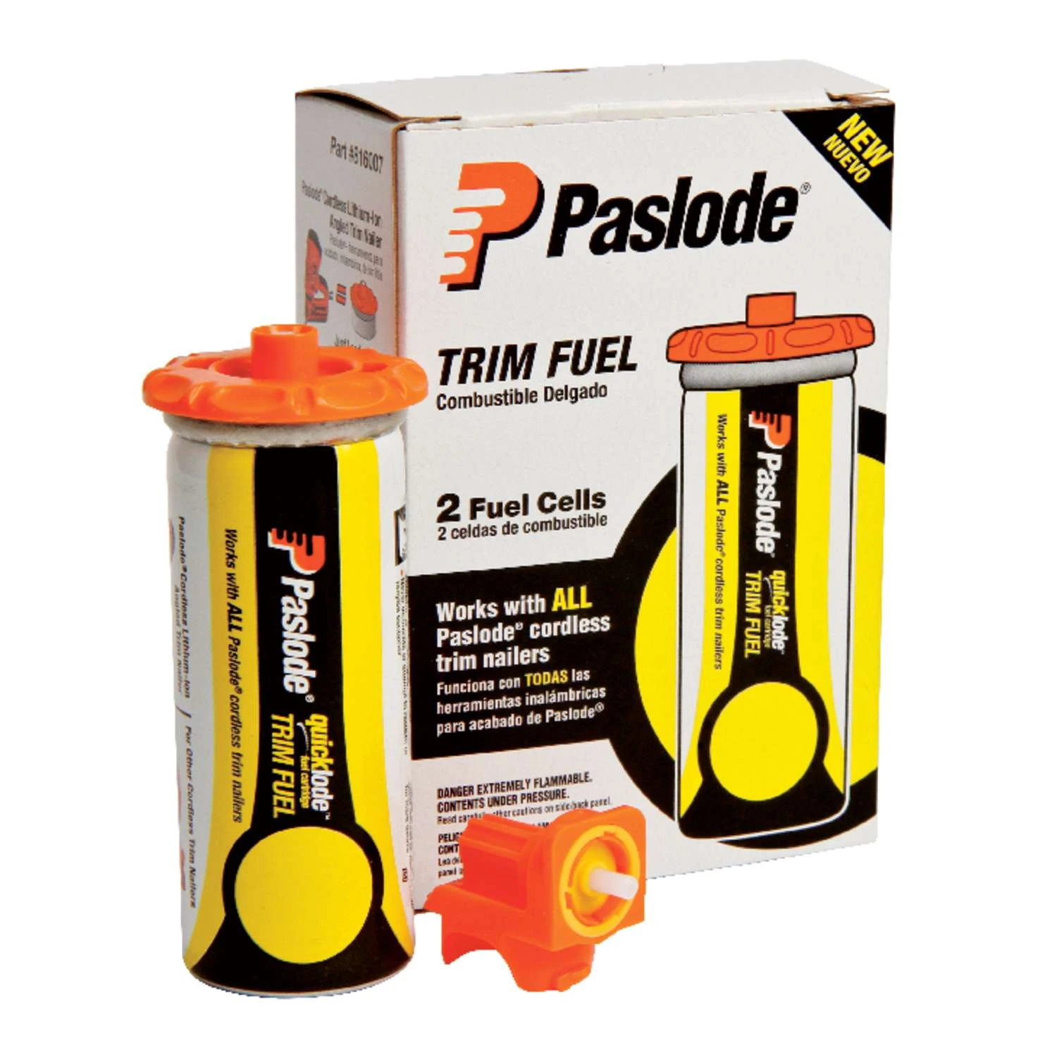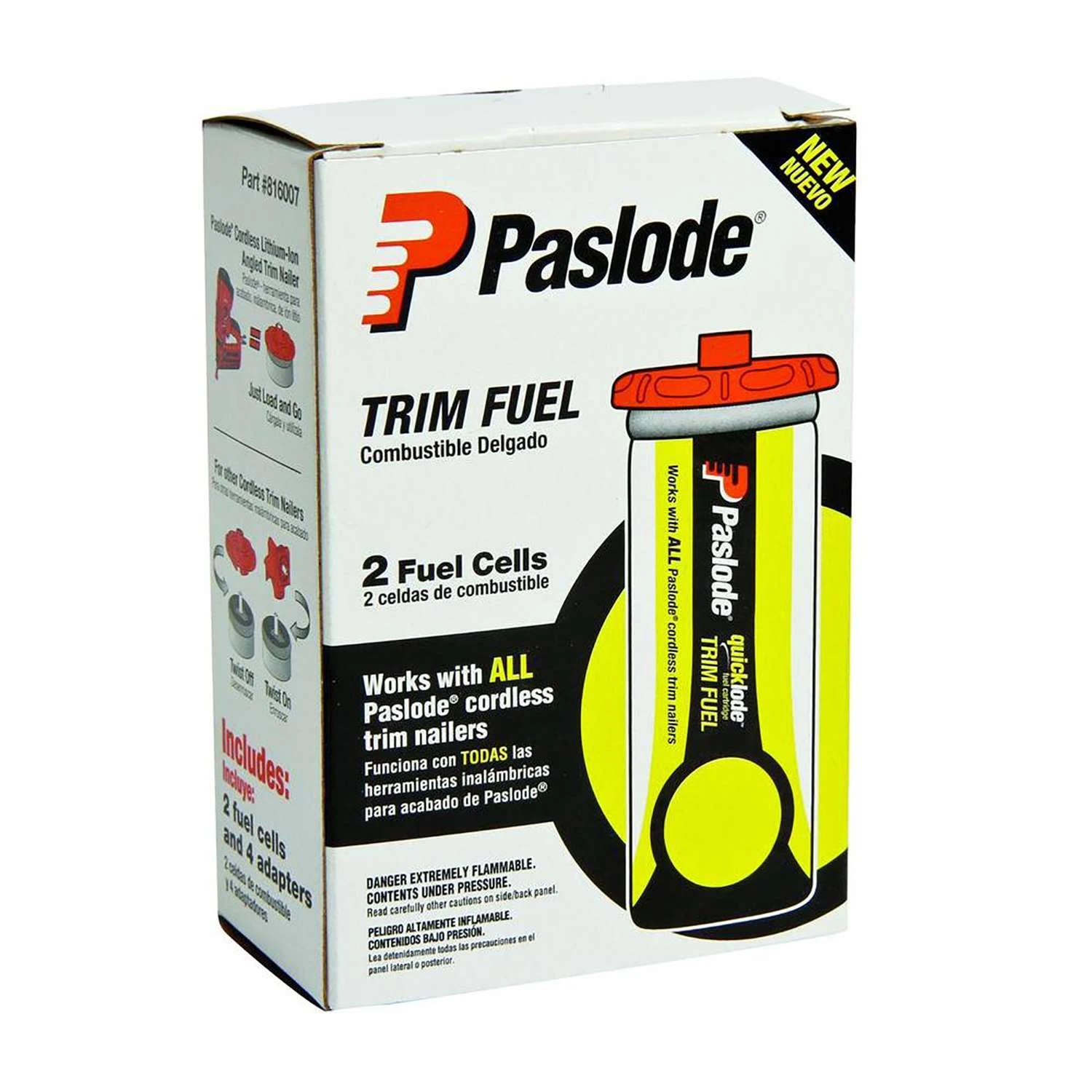 Paslode fuel cells give you the power to drive up to 1000 nails and are easy to load. Use Paslode fuel as part of your nailing or stapling system to keep going until the job is done. Convenient easy to install, just load and go Premium grade fuel Provides a precise fuel dose for reliable drive performance Universal trim fuel works with all Paslode cordless finish nailers Includes two twist on external metering valve adapters