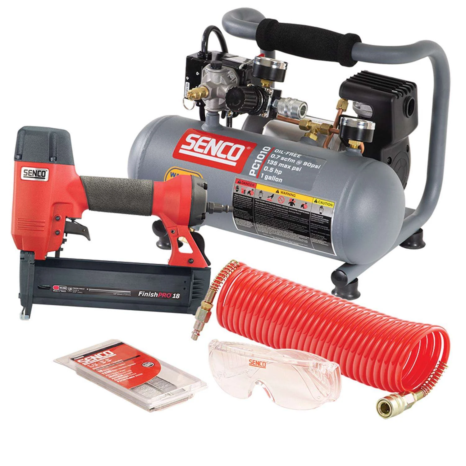 The Finish Pro18 brad nailer is a versatile nailer for all your finish needs. The Senco PC1010 compressor is a 1 HP (peak).5 HP (running), 1 gallon, oil-less portable air compressor. Its lightweight, rugged design will satisfy the needs of the pro. Variety pack of 18 ga. brad nails 1 gallon electric oil-less compressor Tool oil and safety glasses All necessary air fittings