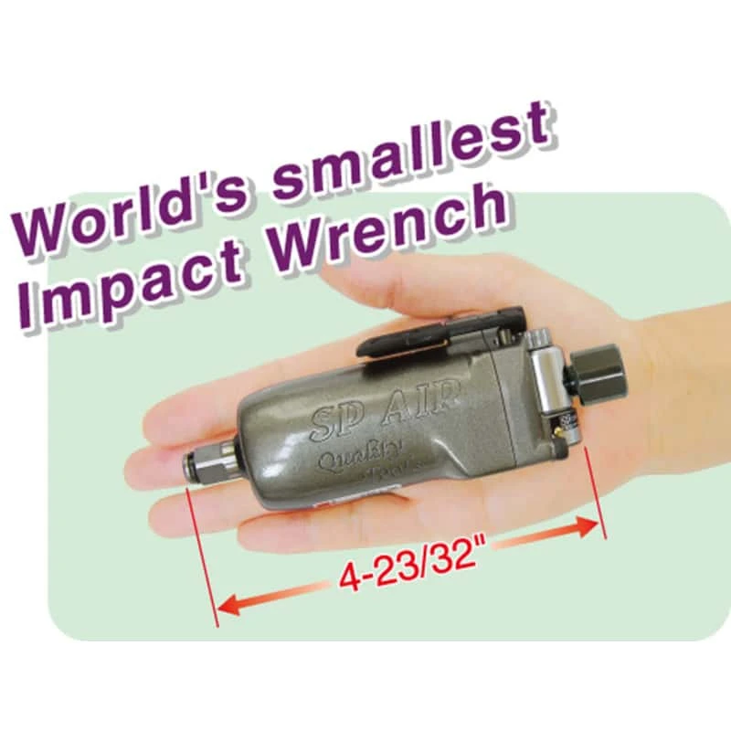 Small and lightweight palm-size design but very powerful, Double-hammer mechanism produces more power with balanced impact blows, Built in air regulator and 160 degree swivel air inlet. Butterfly throttle for one hand forward and reverse operation Durable and high quality construction Worlds smallest impact wrench