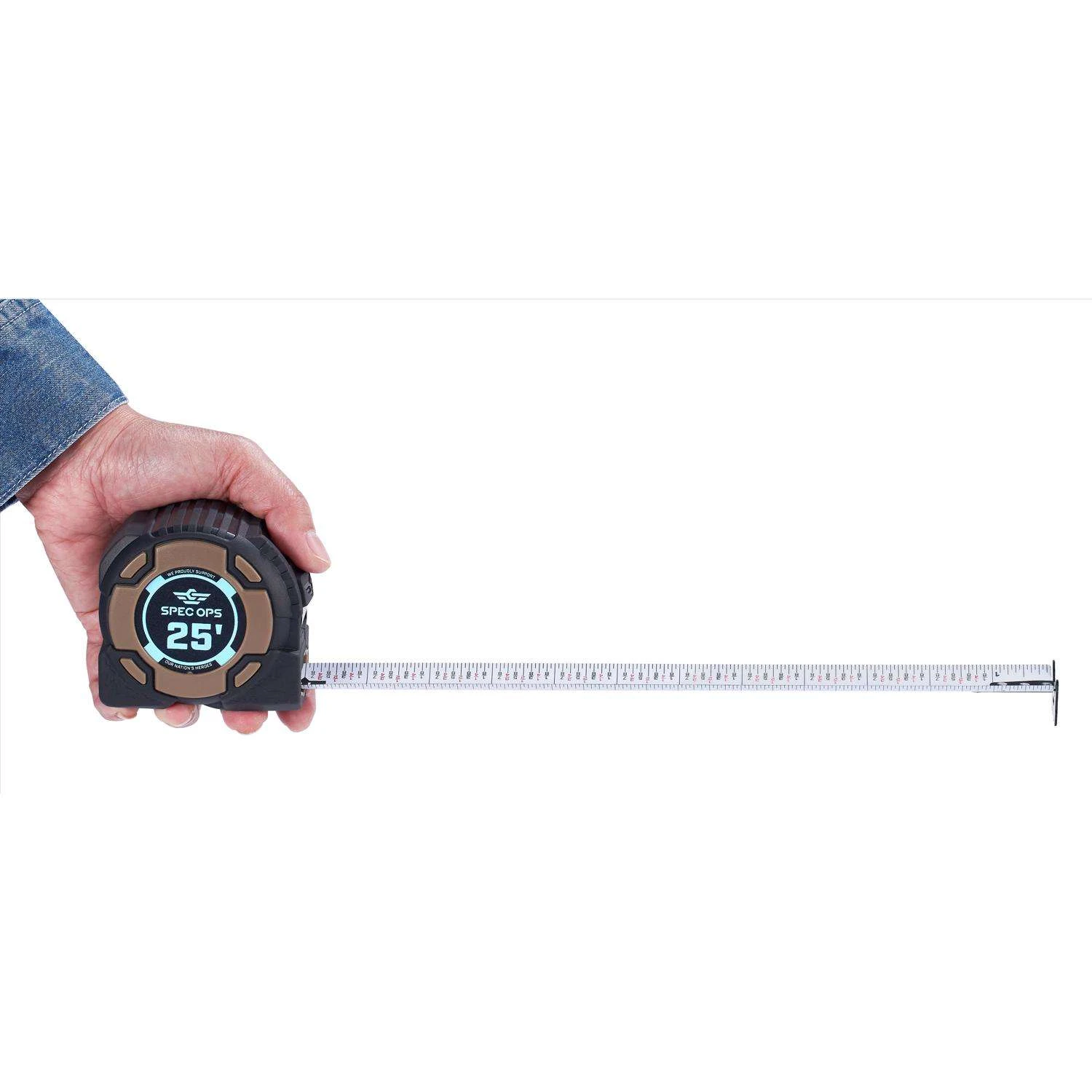 This Spec Ops 25 ft. premium tape measure delivers compact military precision and accuracy. Featuring a military-grade housing, impact-resistant case that lasts 2x longer than the rival 25 ft. tape measures, this best-in-class tape measure is ideal for pocket carry or for operators looking for a more compact tape measure. Boasting a rigid, true 14-foot blade standout, this tape measure allows for a maximum 14-foot reach while the non-slip blade hook gives you ultimate control with added burrs that securely grip surfaces. The 1-1/4 in. MIL-X coated blade offers up to 5x durability while providing the highest visibility and contrast with a bright, white blade for precise measurement reading and marking in dark spaces. The precision-speed lock quickly locks and releases the blade for one-handed use when marking or scribing measurements. And mission capability on the world’s toughest job sites, this tape measure has been drop tested to surpass MIL-SPEC standards. All Spec Ops tools are backed by each purchase made, we support our nation’s heroes by donating 3% of proceeds to veteran and first responder causes. Non-slip hook designed with added burrs to securely grip surfaces Precision speed-lock quickly locks and releases blade Long lasting