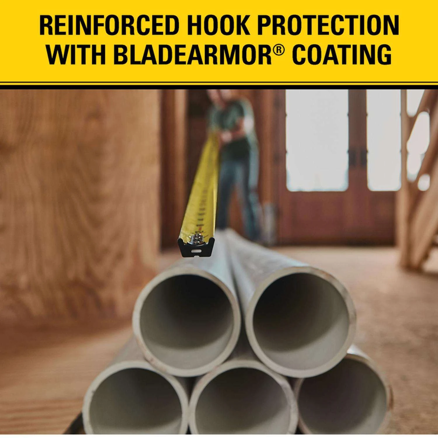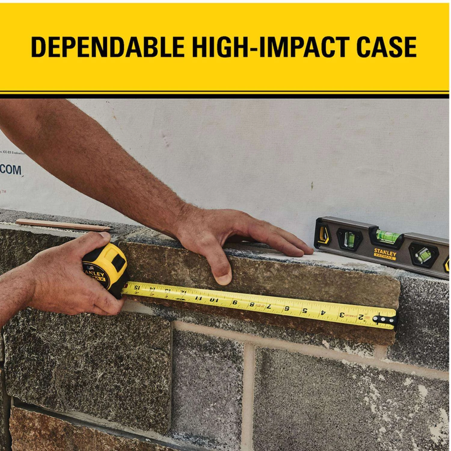 With 14 ft. of reach and a durable, high-impact case, this STANLEY 25 ft. FATMAX Classic Tape Measure will fit your toolbelt, your hand, and the job. Protective full tape blade coating and added BladeArmor at the hook extends tape life, protecting against abrasion and heavy use. Large, easy-to-read numbers and standard stud markers enhance accuracy, making the STANLEY 25 ft. FATMAX Classic Tape Measure dependable on any job site. GET MEASUREMENTS ON YOUR OWN with 14 ft. of reach (based on maximum extension of average professional user) STANDS UP TO JOB SITE DEMANDS: Durable, high-impact case with non-slip rubber EASY-TO-READ MEASUREMENTS with large font numbers STANDS UP TO ABRASION AND REPEATED USE with durable full tape blade coating ENHANCED DURABILITY: Added BladeArmor coating at the hook extends tape life (compared to STANLEY tape 30-455)