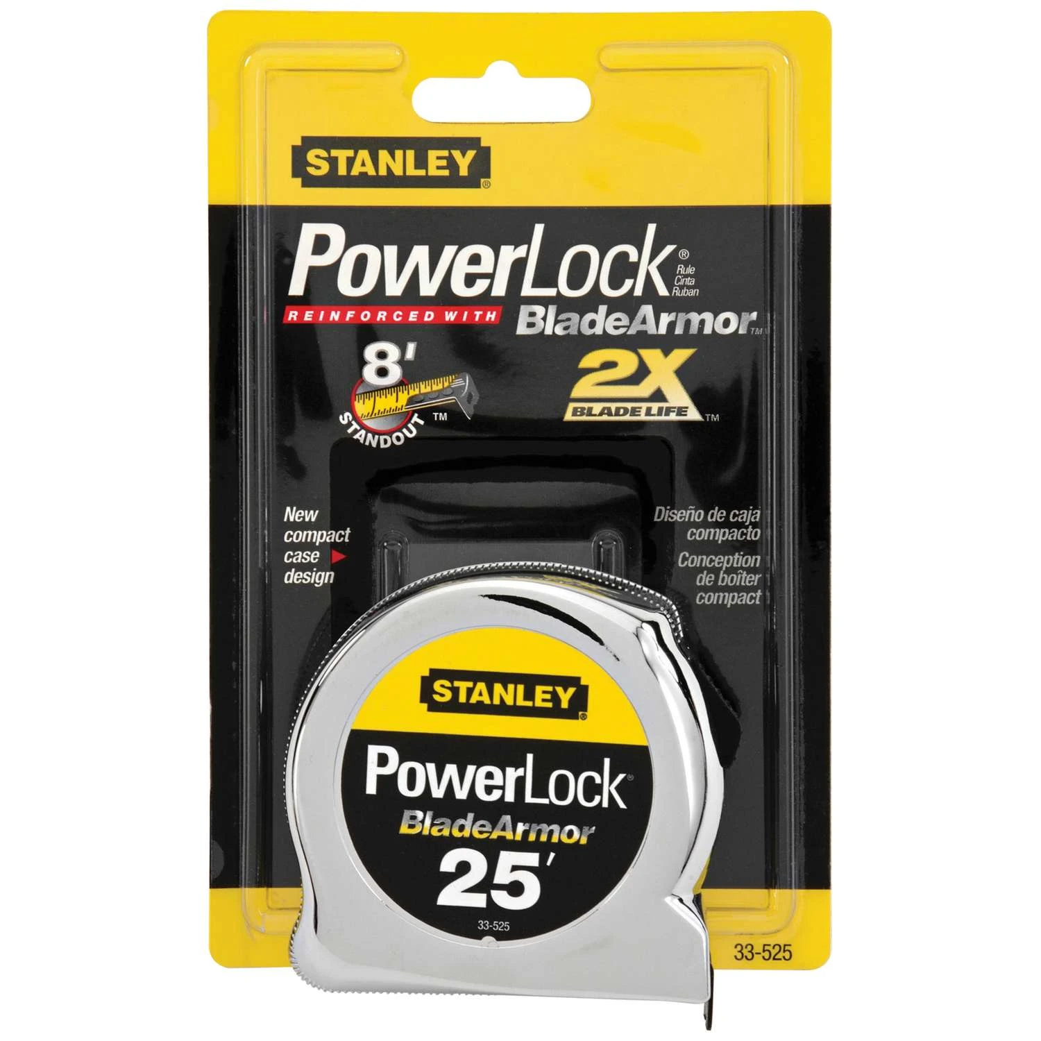 The STANLEY 25 ft. PowerLock Tape Measure blade is reinforced BladeArmor coating for maximum durability. This tape has up to an 8 ft. standout. To simplify framing jobs, the bright yellow, easy-to-read blade has 16 in. and 19.2 in. stud center markings. Mylar polyester film extends life of entire blade Secure blade lock keeps blade in place for accurate measurements Three-rivet, corrosion-resistant Tru-zero end hook for accurate measurements 8 ft. blade standout