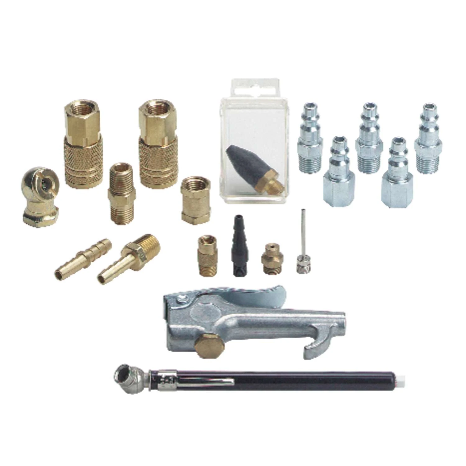 Kit contains all accessories needed to connect and use a tank mounted air compressor. Includes couplers plugs for air line hose and air tool connections air line chuck for filling tire valves tire gauge, to check air pressure blowgun kit with multiple. nozzles for general cleaning, drying and clearing ball and tapered inflator nozzles for inflating toys and recreational equipment. Made of steel Compressor Acc. Kit drying and clearing ball and tapered inflator nozzles for inflating toys and recreational equipment.