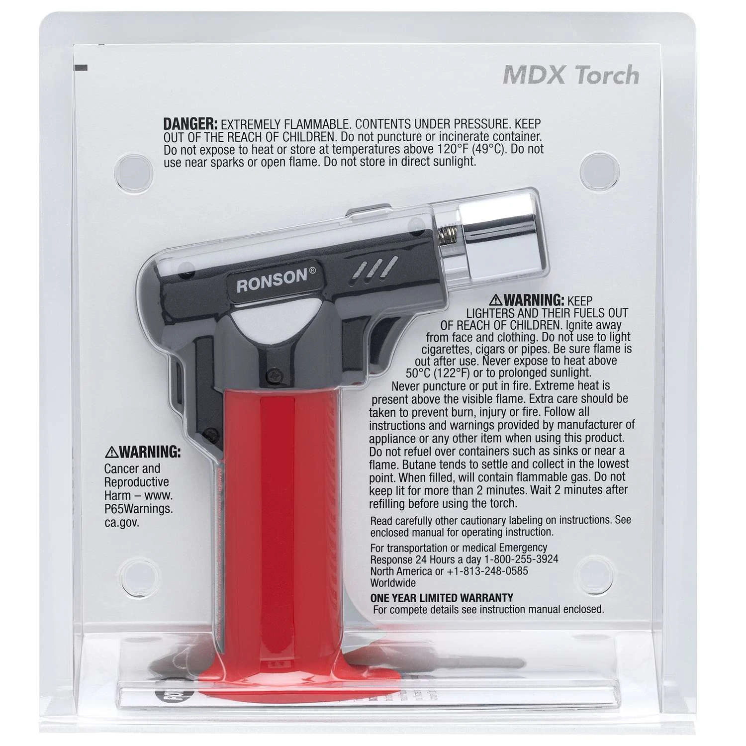The Ronson MDX Torch delivers power and performance when you need it most. This durable torch with patented ignition lights with ease and burns strong with an adjustable soft yellow or blue flame torch. Perfect for fire starting, soldering, heating, melting and thawing. Patent pending child-resistant palm lock helps deter children from activating ignition Provides extra flame height in any situation Adjustable flame Blue or yellow flame functionality Provides high precision heat